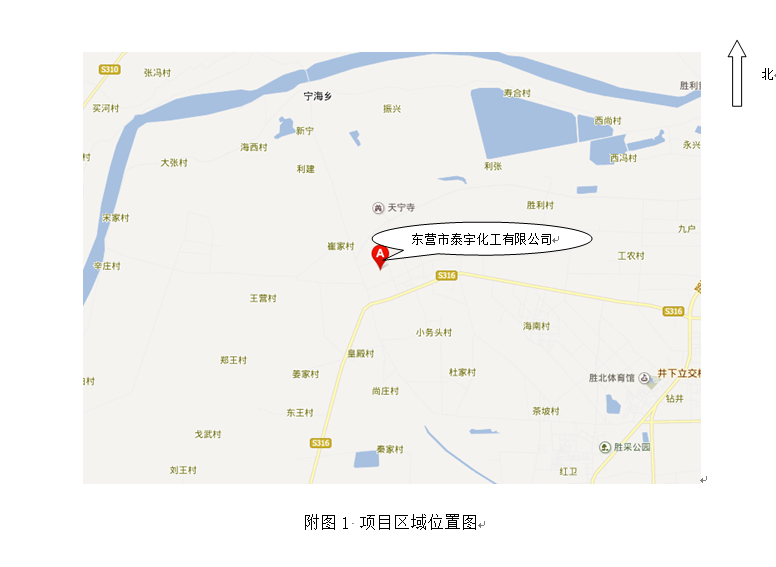 東營(yíng)市泰宇化工有限公司位于墾利縣勝坨鎮工業(yè)園區。廠(chǎng)區北面為勝坨鎮工業(yè)園區道路,路對面為東辰集團建筑安裝有限公司,南側為寶仕達公司(為油田生產(chǎn)設備配件的企業(yè)),東側為東辰集團溶劑油項目,西側為工業(yè)園區道路,道路西側為空地。 |
