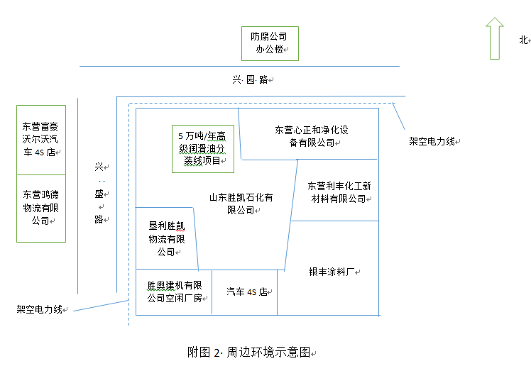東側:廠(chǎng)區圍墻東側自北向南依次為東營(yíng)心正和凈化設備有限公司(石油裝備生產(chǎn)企業(yè))、東營(yíng)利豐化工新材料有限公司與銀豐涂料廠(chǎng),共用圍墻。西側:廠(chǎng)區西側為興盛路,路對面為東營(yíng)富豪沃爾沃汽車(chē)4S店與東營(yíng)鴻德物流有限公司。南側:廠(chǎng)區圍墻南側為墾利勝凱物流有限公司、勝奧建機有限公司空閑廠(chǎng)房、汽車(chē)4S店。北側:廠(chǎng)區北側圍墻外為興園路,路北為一家防腐公司辦公樓。 |