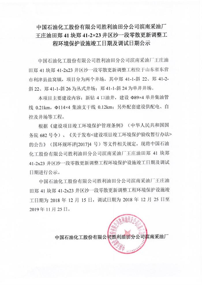 中國石油化工股份有限公司勝利油田分公司濱南采油廠(chǎng)王莊油田鄭41塊41-2×23井區沙一段零散更新調整工程環(huán)境保護設施竣工日期及調試日期公示