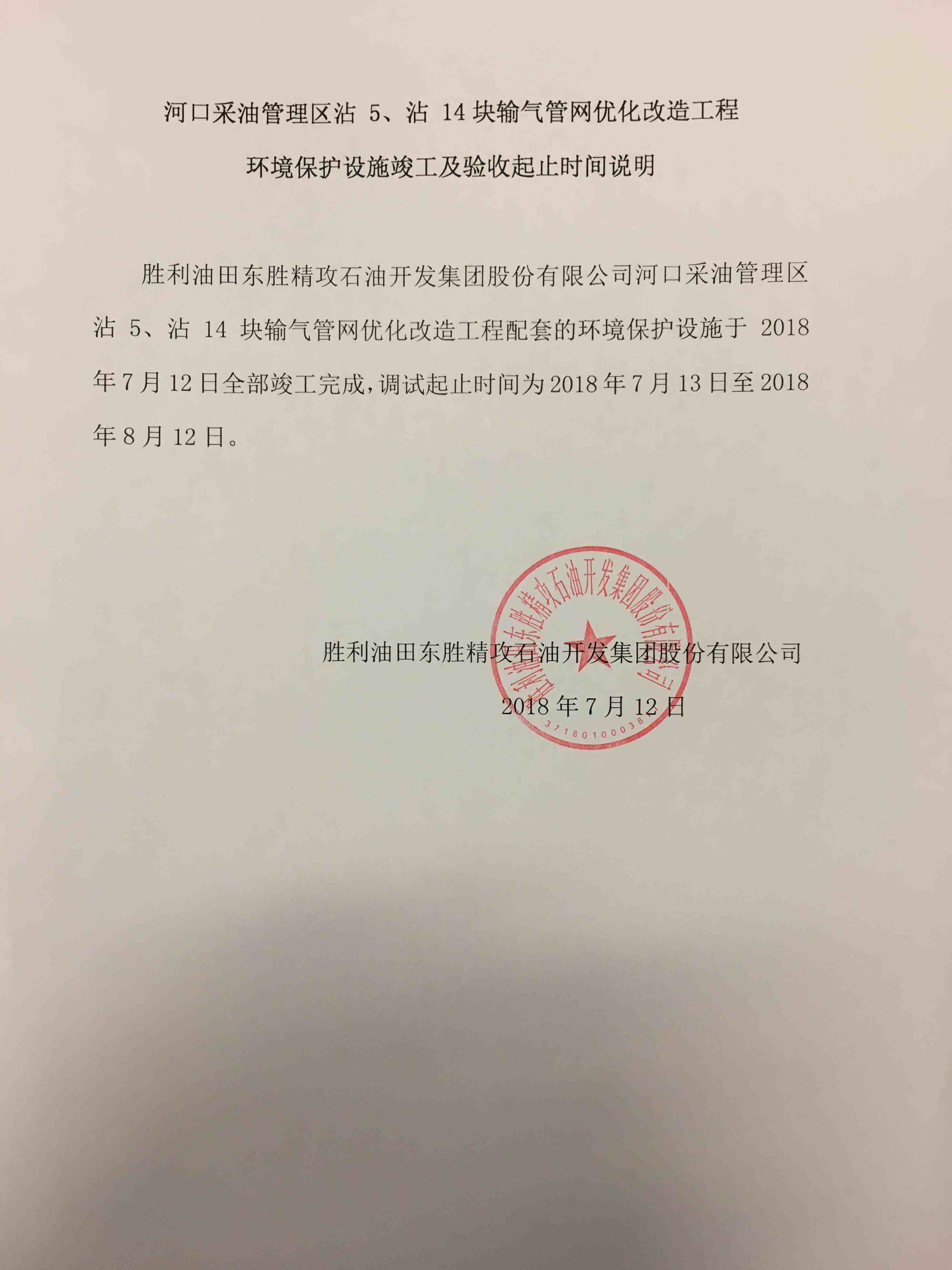 河口采油管理區沾5、沾14塊輸氣管網(wǎng)優(yōu)化改造工程環(huán)境保護設施竣工及驗收起止時(shí)間說(shuō)明