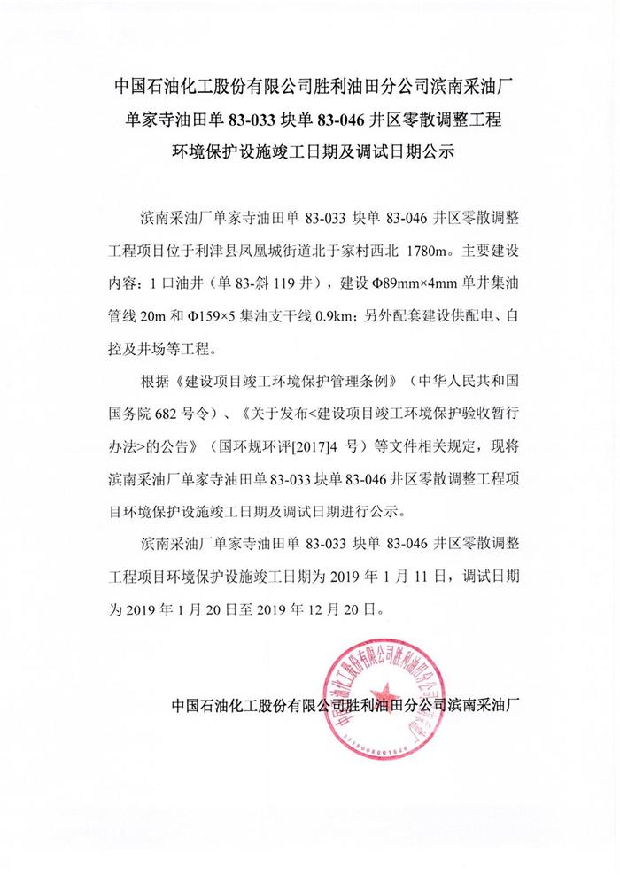 中國石油化工股份有限公司勝利油田分公司濱南采油廠(chǎng)單家寺油田單83-033塊83-046井區零散調整工程環(huán)境保護設施竣工日期及調試日期公示