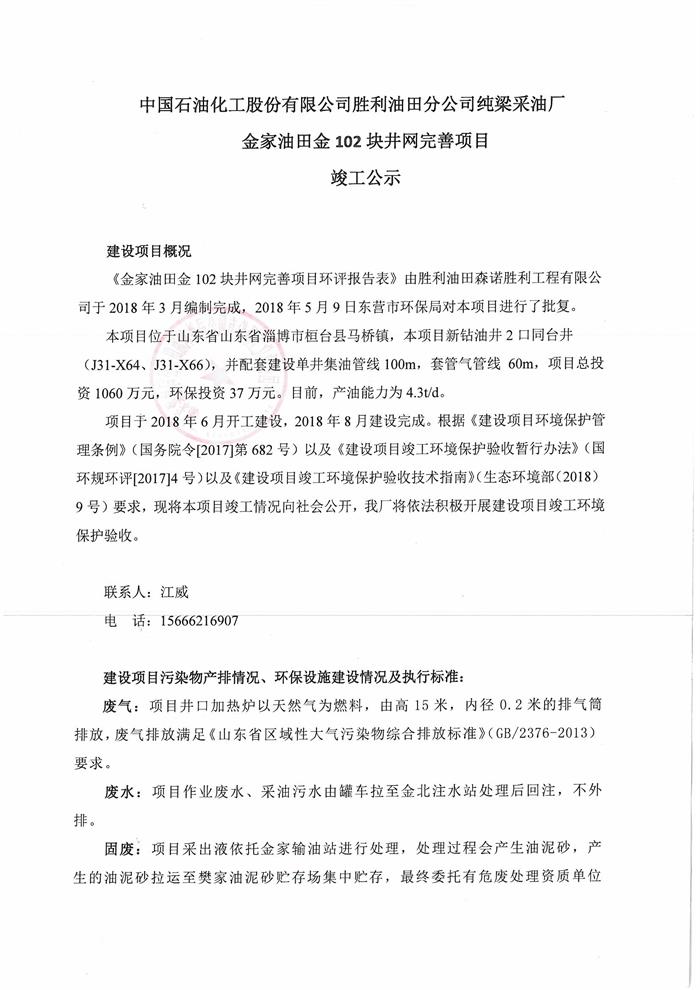 中國石油化工股份有限公司勝利油田分公司純梁采油廠(chǎng)金家油田金102塊井網(wǎng)完善項目竣工公示