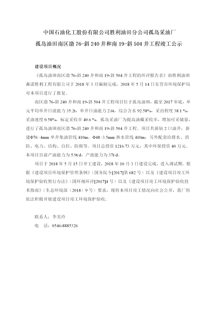 中國石油化工股份有限公司勝利油田分公司孤島采油廠(chǎng)孤島油田南區渤76-斜240井和南19-斜504井工程竣工公示