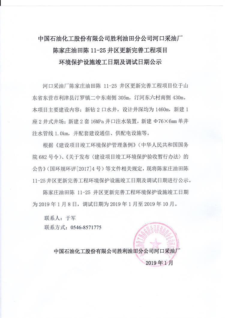 中國石油化工股份有限公司勝利油田分公司河口采油廠(chǎng)陳家莊油田陳11-25井區更新完善工程項目 環(huán)境保護設施竣工日期及調試日期公示