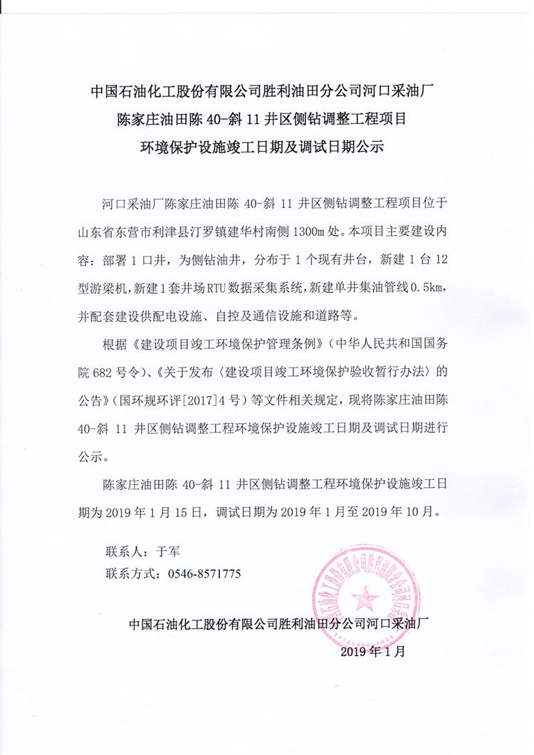 中國石油化工股份有限公司勝利油田分公司河口采油廠(chǎng)陳家莊油田陳40-斜11井區側鉆調整工程項目 環(huán)境保護設施竣工日期及調試日期公示