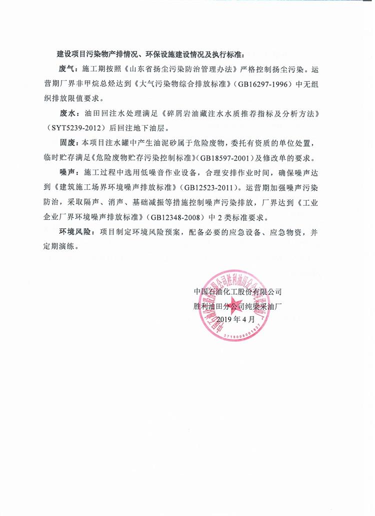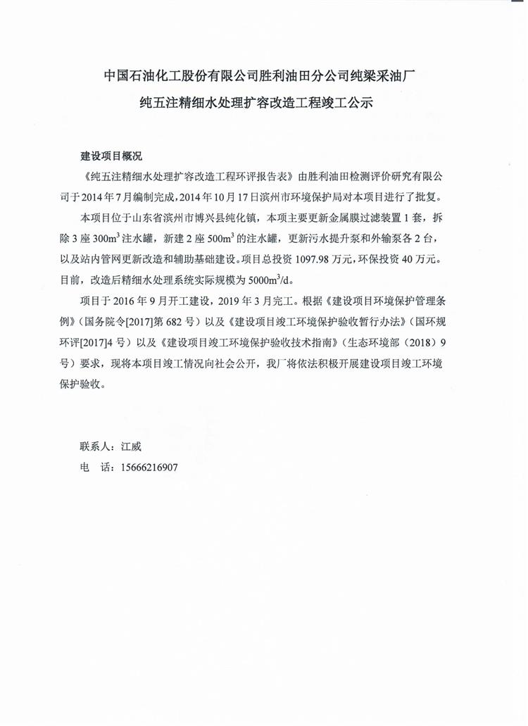 中國石油化工股份有限公司勝利油田分公司純梁采油廠(chǎng)純五注精細水處理擴容改造工程竣工公示