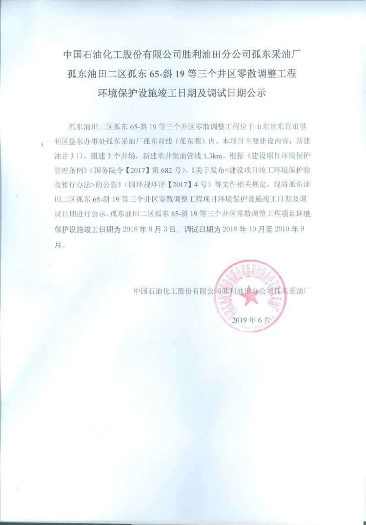中國石油化工股份有限公司勝利油田分公司孤東采油廠(chǎng)孤東油田二區孤東65-斜19等三個(gè)井區零散調整工程環(huán)境保護設施竣工日期及調試日期公示