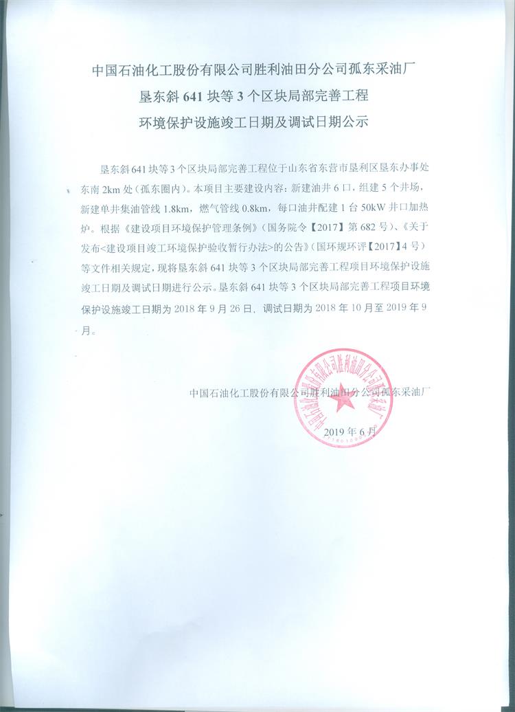 中國石油化工股份有限公司勝利油田分公司孤東采油廠(chǎng)墾東斜641塊等3個(gè)區塊局部完善工程環(huán)境保護設施竣工日期及調試日期公示